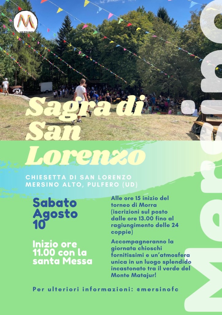 Ecco la locandina della festa di San Lorenzo, vi aspettiamo numerosi sabato 10 agosto alla chiesetta di San Lorenzo – località Mersino Alto – per passare una giornata di allegria con la nostra comunità!